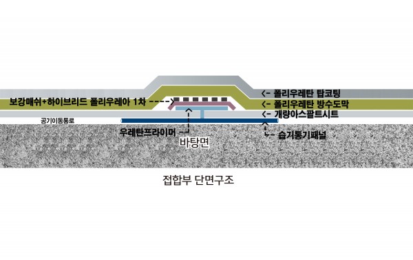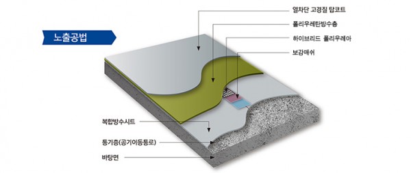 개량형복합시트+ 하이브리드 우레아접합 + 폴리우레탄방수도막 + 탑코팅으로 구성된 방수층은