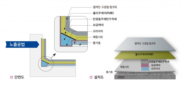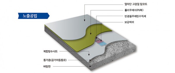 개량형복합시트+ 폴리우레탄방수도막 + 순수우레아접합(경도90이상) + 탑코팅으로 구성된 방수층은